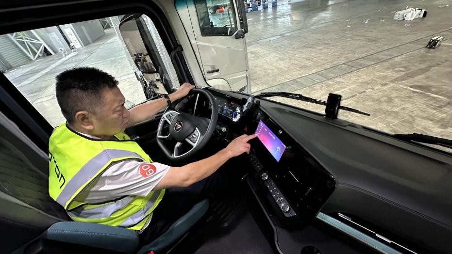 目光扫过中控台,怀挡设计让操作杆紧紧贴在方向盘右侧,换挡时手不用离开方向盘太远;周围的按键布局得清清楚楚,常用的空调调节、驻车制动按钮触手可及,连充电接口都分了24V电源、USB口,手机、对讲机充电各得其所。老张对着新的触控大屏很是摆弄了一会儿。