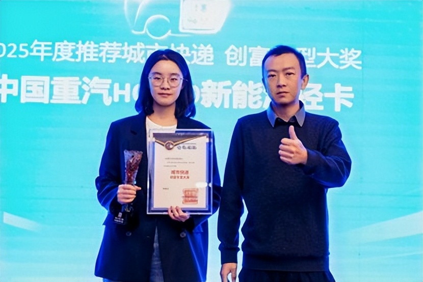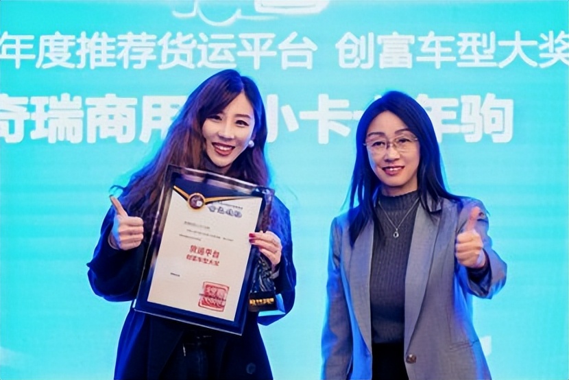 中国快递协会副秘书长董晓云(右)为获奖企业奇瑞商用车代表颁奖